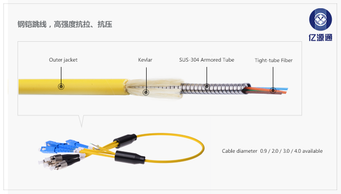铠装跳线是一种新型的光纤跳线,特别设计了一层不锈钢套管来保护光纤,具有标准光纤跳线的优点和功能,但同时具备了铠装的耐用性。